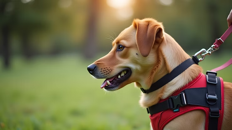 Dog wearing harness and leash during training session